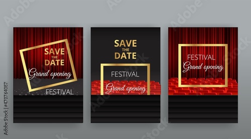 Набор шаблонов вертикальных баннеров для кино и театрального искусства. Векторная иллюстрация театральной сцены с красными занавесками, театральными трагедийными и комедийными масками, ретро-кинопроектором и катушками с пленочной лентой.