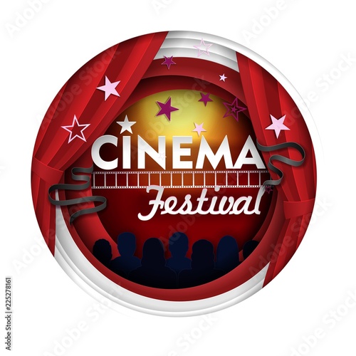 Шаблон дизайна баннера афиши кинофестиваля. Векторные вырезанные из бумаги декорации кинотеатра с диафильмом, аудитория в круглой рамке.