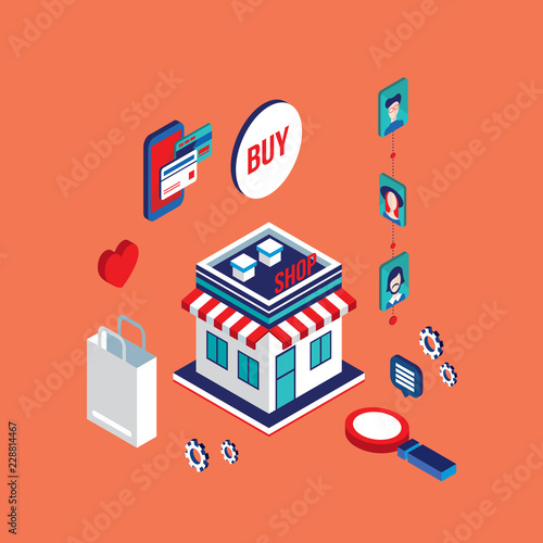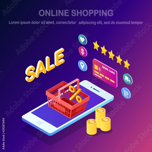 Бронирование билетов в кино онлайн концептуальная векторная изометрическая иллюстрация. Символы кинотеатра - хлопушка, попкорн, 3D-очки, газировка, билеты, кнопка "Купить сейчас", размещенная на экране смартфона.