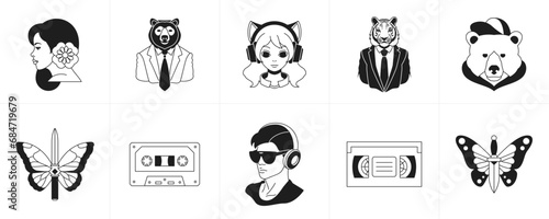 Элемент дизайна цирка - черно-белый силуэт изолированного набора. Акробат, иллюзионист, силач, клоун, билет, дрессированные животные и векторная иллюстрация палатки