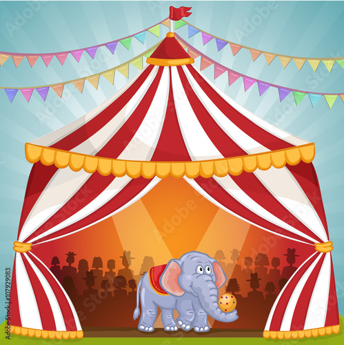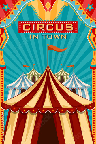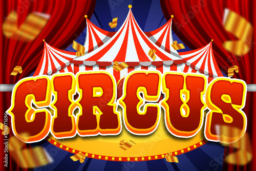 Шаблон рекламного плаката цирка. Векторная иллюстрация, вырезанная из бумаги. Цирк биг топ с воздушным акробатом, фокусником, дрессированными животными, клоуном-жонглером.