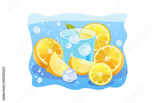 Шаблон дизайна рекламного плаката безалкогольных напитков. Векторная реалистичная алюминиевая банка с этикеткой, ломтиками лимона, брызгами цитрусового сока и пробелом для копирования.