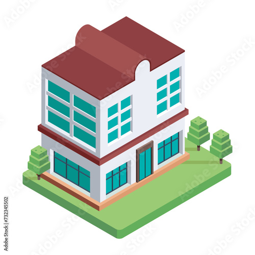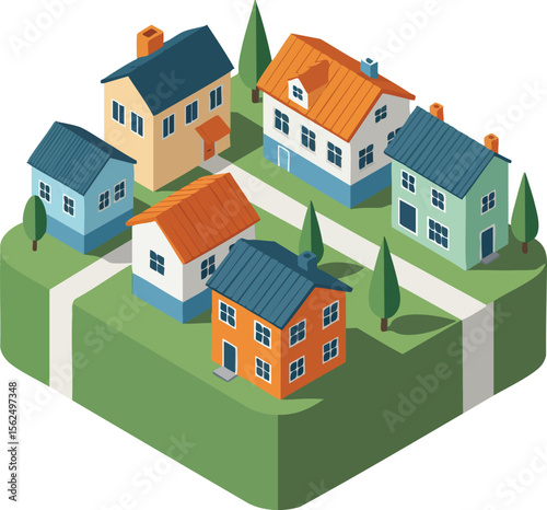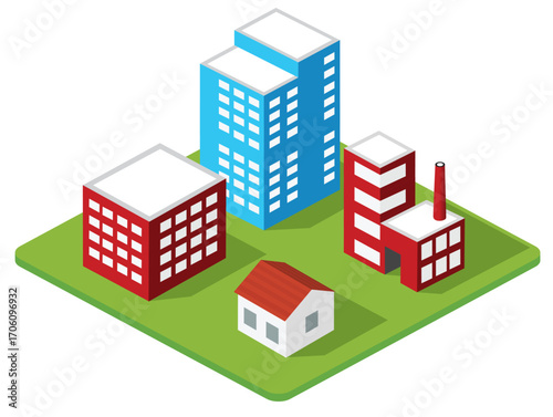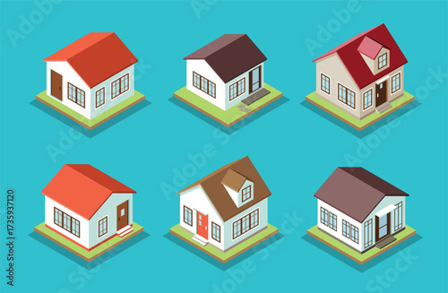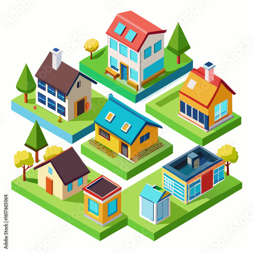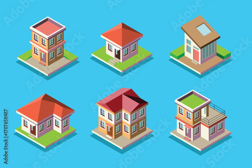 Набор городских многоквартирных домов, векторная изолированная иллюстрация. Изометрический многоэтажный жилой дом снаружи, вид спереди, фасад дома.