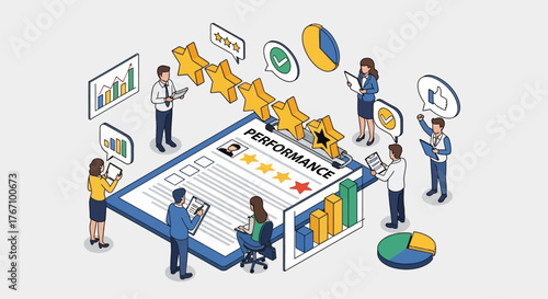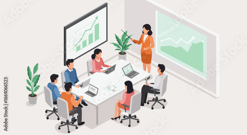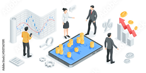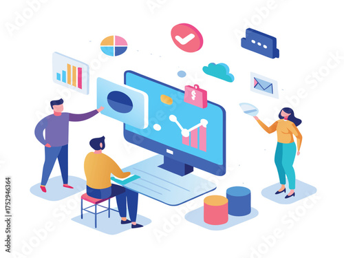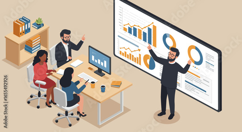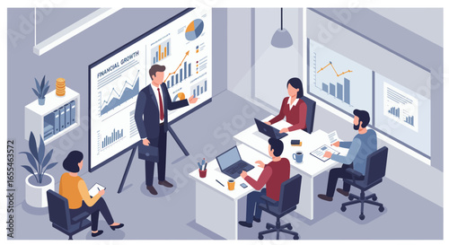 Городское планирование и процесс градостроительства. Профессиональная команда архитекторов создает, анализирует и обсуждает строительный проект. Люди встречаются для создания городского пейзажа изометрическая векторная иллюстрация