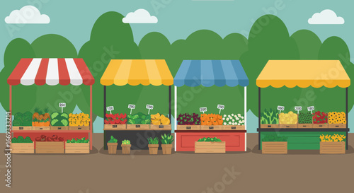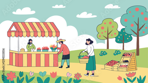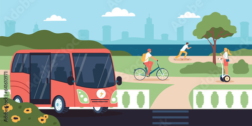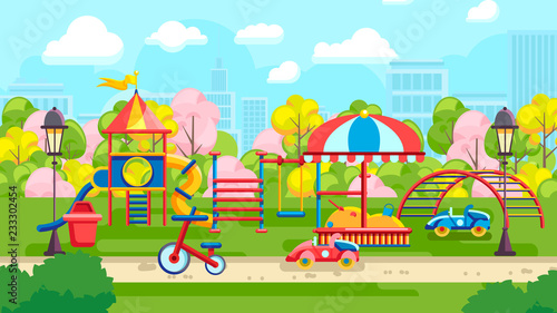 Векторная иллюстрация концепции городского общественного парка. Продавец мороженого продает рожки с мороженым, дети играют в мяч, женщина выгуливает собаку, дворник с метлой. Дизайн в плоском стиле.
