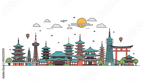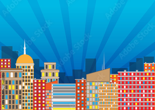 Бесшовный вектор будущего города. Городской пейзаж со зданием. Современный городской пейзаж на фоне горизонта. Сцена с небоскребом. Промышленная панорама. Иллюстрация футуристического города