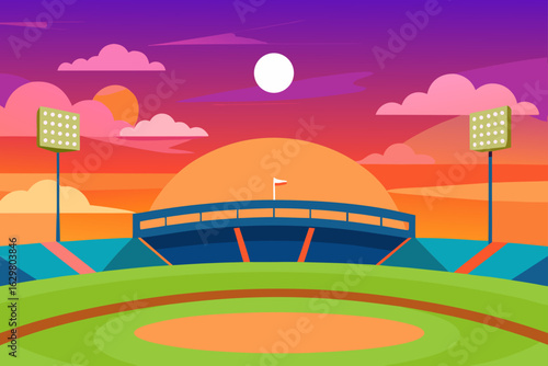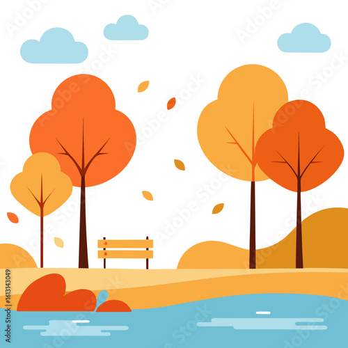Городской пейзаж, оранжевый пейзаж заката, векторная иллюстрация. Прекрасный вечерний вид на городской пейзаж. Городской парк, городские здания.