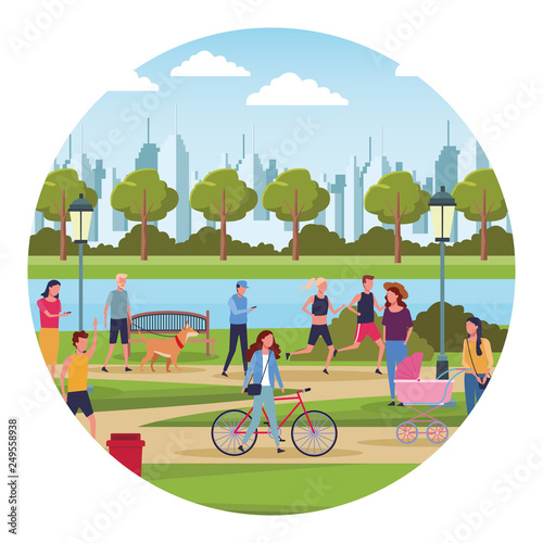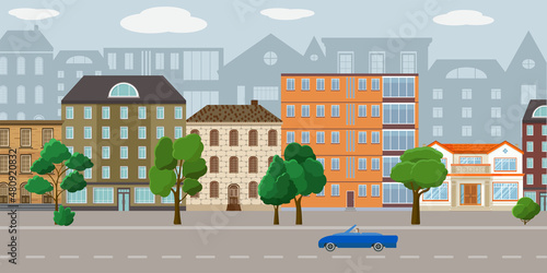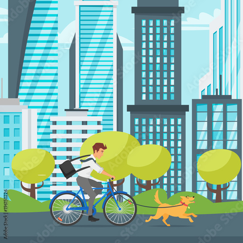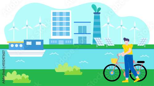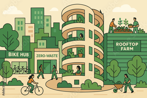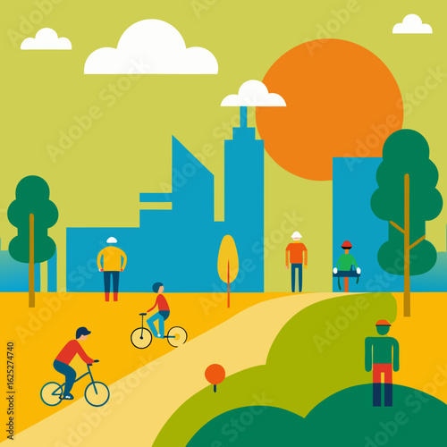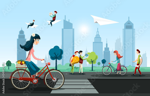 Векторная иллюстрация концепции городской улицы в плоском стиле. Тележка с уличной едой или трехколесный кофейный велосипед, спортивный пандус и люди, покупающие кофе на ходу, катающиеся на велосипеде и скейтборде. Дизайн в плоском стиле.