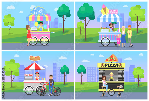 Векторный набор элементов дизайна концепции городской улицы. Городская улица со стоянкой такси, кафе, парком и набережной с тележкой мороженого и кофейным велосипедом, люди отдыхают, покупают еду. Дизайн в плоском стиле.
