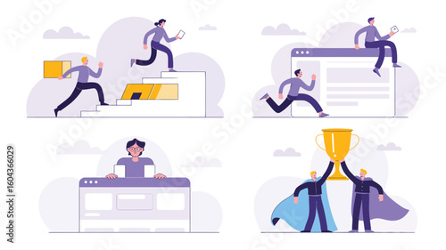 Городской транспорт в аренду, векторная иллюстрация, изолированная на белом фоне. Крутой мультяшный персонаж бородатый мужчина ездит на электрическом скутере, велосипеде, толкающем скутере, гироскутере, сегвее и ведет автомобиль.