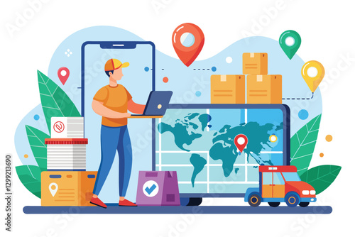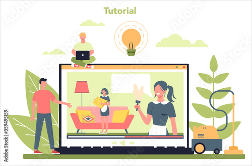 Профессиональные услуги по уборке дома, векторная плоская иллюстрация. Персонажи мужского и женского пола, сотрудники клининговой компании вытирают пыль с бытовой техники и мебели, пылесосят ковер в гостиной.