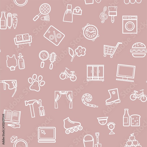 Векторный бесшовный узор с символами поддержки клиентов, значками. Работа с фоном клиентов, текстура оберточной бумаги, тонкая линия, дизайн в плоском стиле.