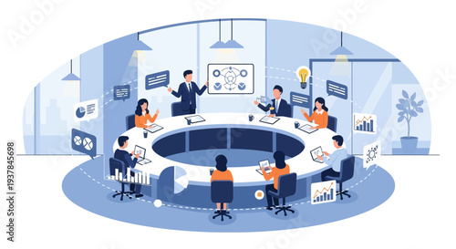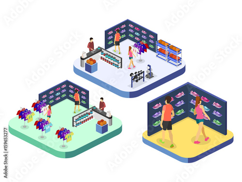 Концепция облачного офиса. Векторная изометрическая иллюстрация офисных помещений с персоналом на облаках, соединенных соединительными линиями.