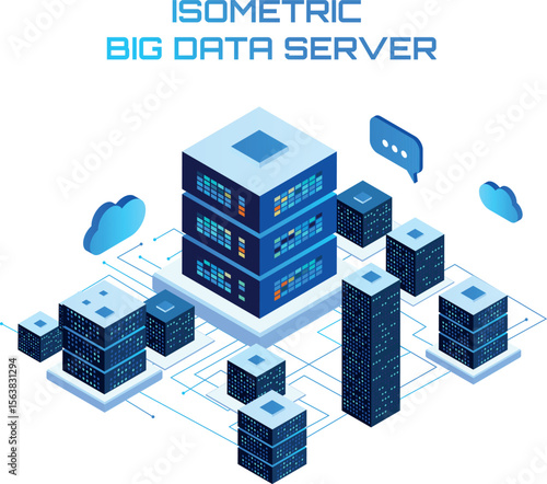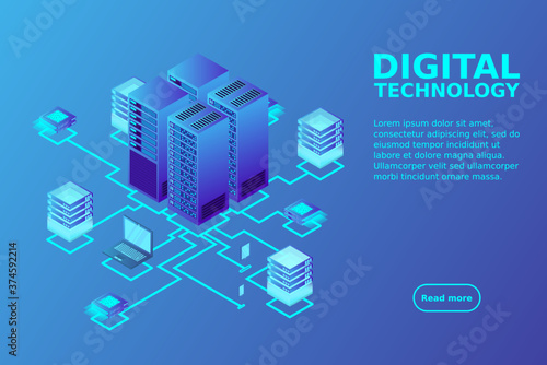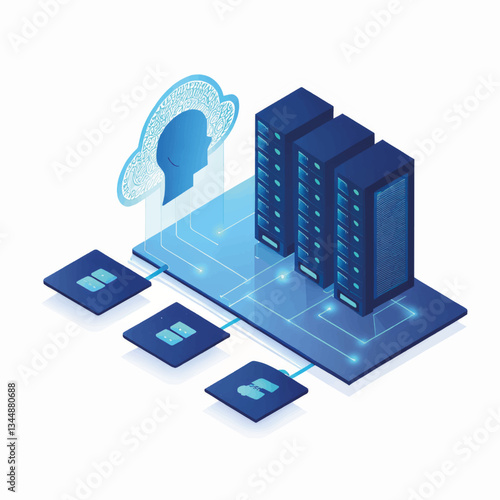 Блок-схема облачного сервиса, векторная иллюстрация. Изометрический портативный компьютер, мобильный телефон, серверные стойки. Концепция облачных вычислений.