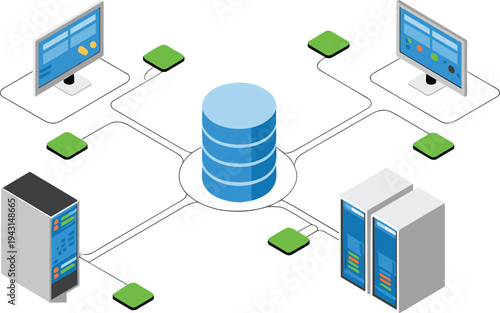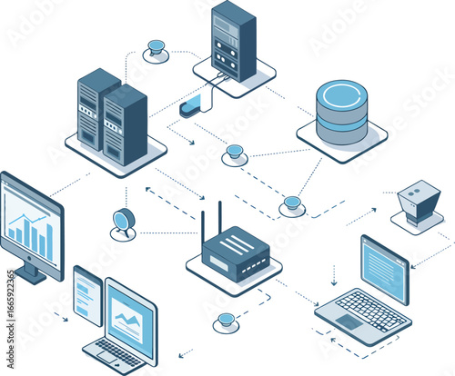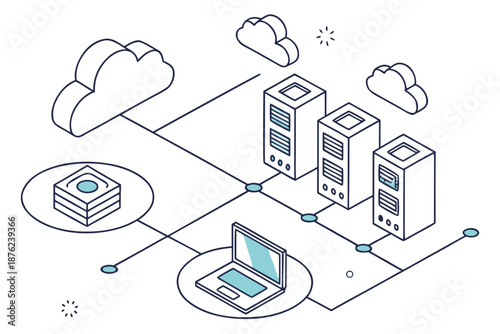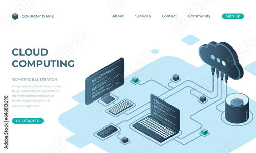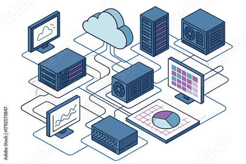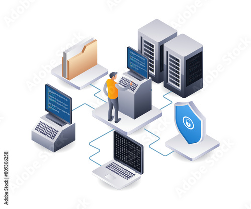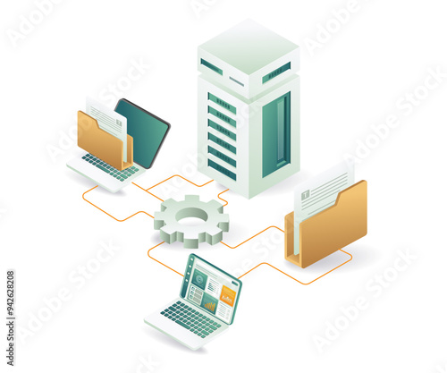 Блок-схема технологии облачных сервисов, изометрическая векторная иллюстрация. Центр обработки данных с серверными стойками, облаком, папкой файлов, документом, подключенным к ноутбуку, настольному компьютеру и мобильному телефону.