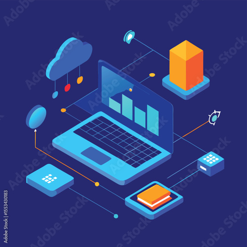 Блок-схема облачного сервиса. Векторная плоская 3d-изометрическая иллюстрация сетевых серверов, интернет-маршрутизатора, ноутбука, мобильного телефона и т.д.