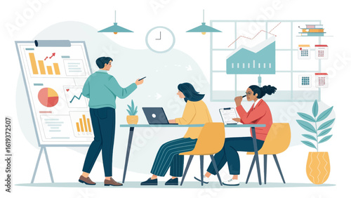 Деловая женщина-тренер проводит презентацию или лекцию, указывая на диаграммы и диаграммы на доске, векторная иллюстрация. Бизнес планирование и управление стратегией учебные курсы для веб сайта страницы и т.д.