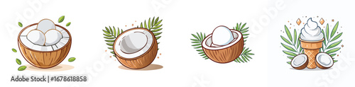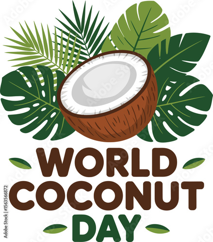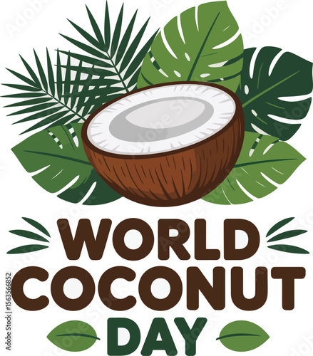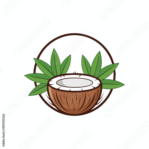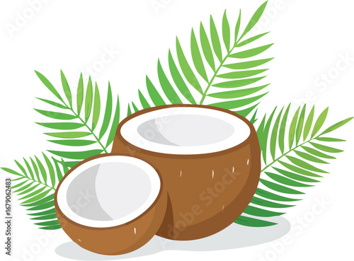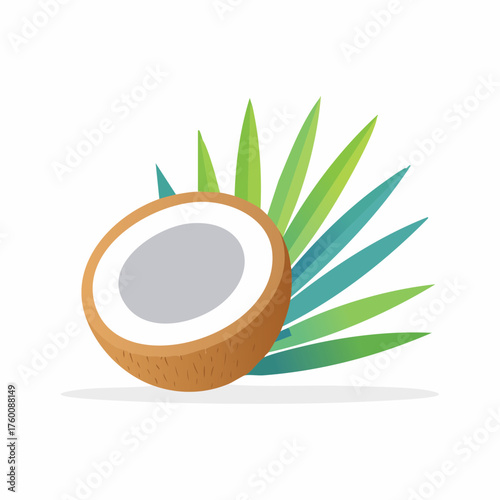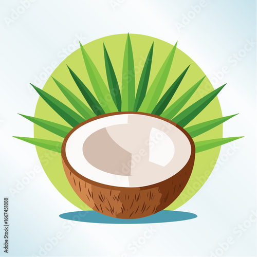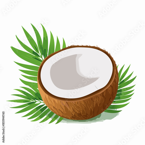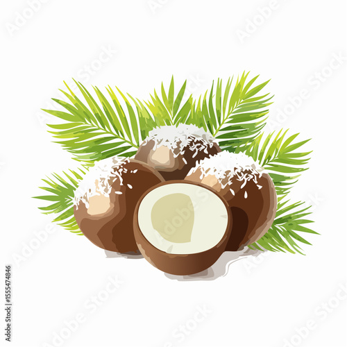 Векторная иконка с изображением кокоса в шоколаде на фоне зеленых пальмовых листьев. Реалистичный элемент дизайна десертных изделий, выделенный на белом фоне