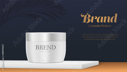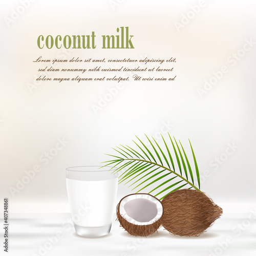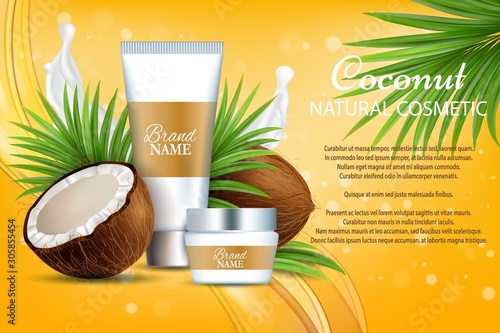 Кокосовая натуральная косметика, векторный шаблон плаката. Реалистичная целая половинка кокоса, тюбик крема, баночка, пальмовые листья. Рекламная композиция бренда косметического продукта по уходу за кожей Organic coconut beauty с текстом.