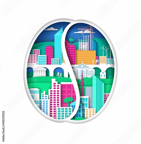 Силуэт кофейных зерен с современными экологичными городскими элементами, векторная иллюстрация в стиле бумажного искусства. Кофе на вынос.