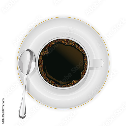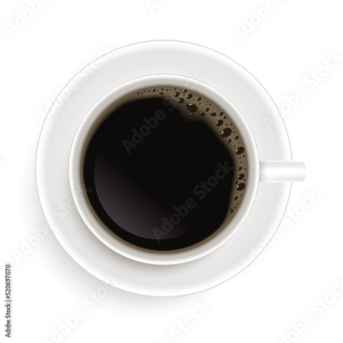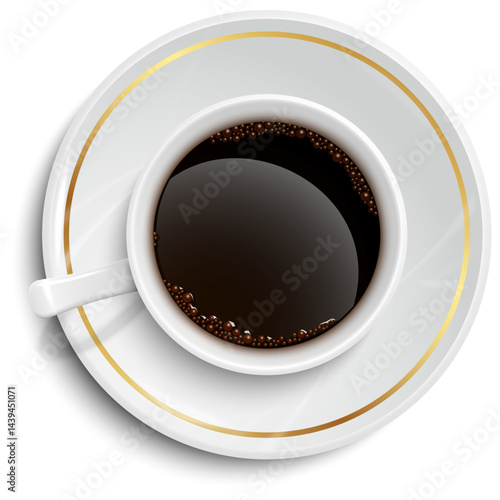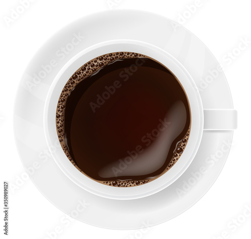 Кофейная чашка на блюдце, вид сверху, векторная иконка. Реалистичная кружка с ароматным напитком на тарелке, выделенная на белом фоне