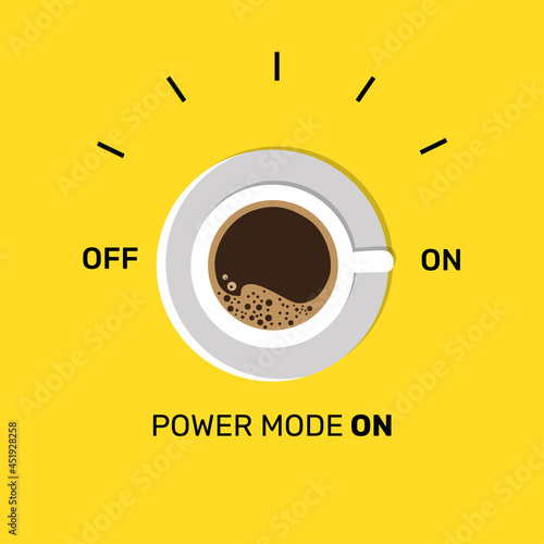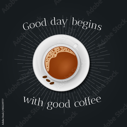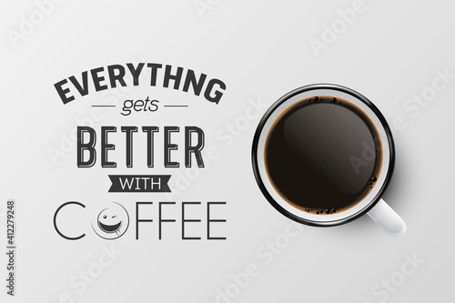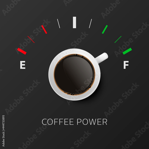Векторная реалистичная иллюстрация концепции энергии кофе. Чашка кофе с видом сверху. Надпись, полная энергии. Кофейный плакат, шаблон дизайна флаера.