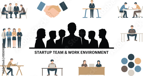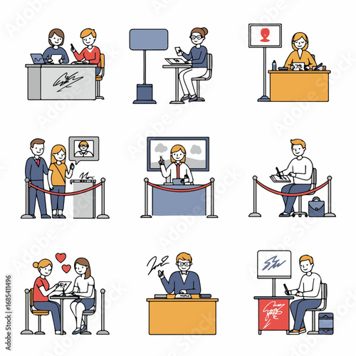 Векторная иллюстрация персонала кофейни официантки, официанта, бармена, кондитера и посетителей, клиентов. Символы людей кофейни, значки, выделенные на белом фоне. Дизайн в плоском стиле.
