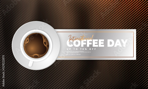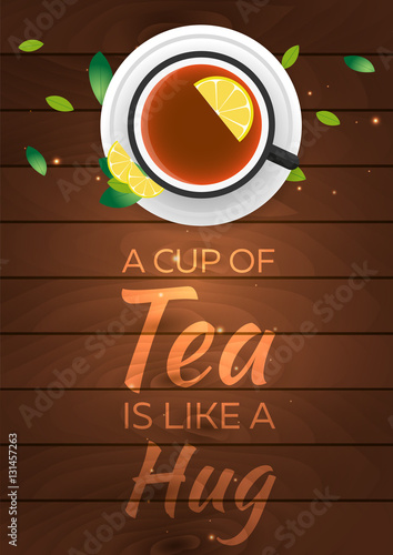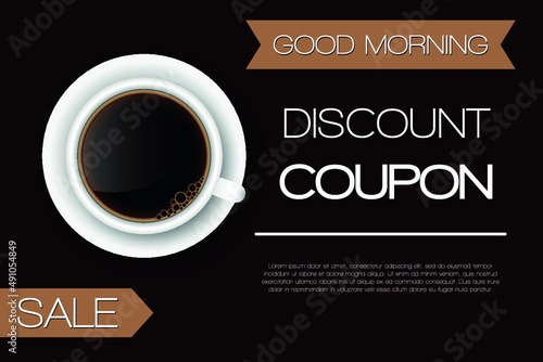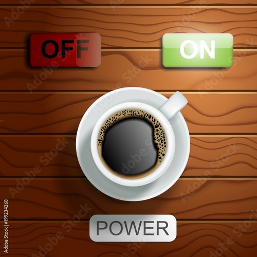 Векторная реалистичная иллюстрация концепции кофейной энергии. Вид сверху на чашку кофе на фоне дерева. Кофейный плакат, шаблон дизайна флаера.