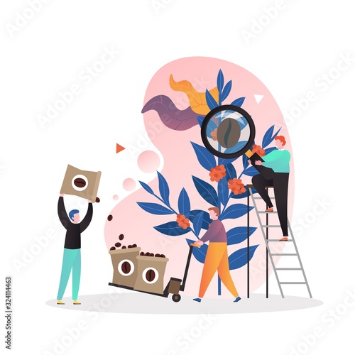 Персонажи мужского пола фермеров, обрабатывающие кофейную вишню и упаковывающие бобы, векторная иллюстрация. Производственная композиция для кофейной промышленности для веб-баннера, страницы веб-сайта и т.д.