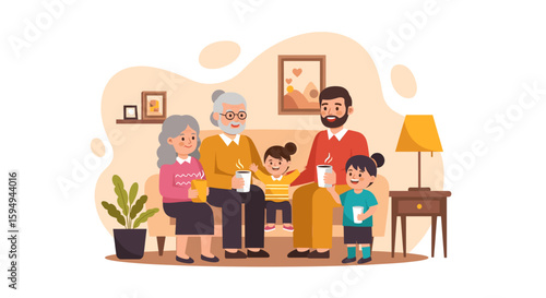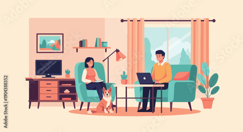 Сцена в кофейне. Счастливая женщина пьет кофе и работает на портативном компьютере, сидя за столом, плоская векторная иллюстрация. Фриланс, удаленная работа. Кофейня, интерьер кафе.