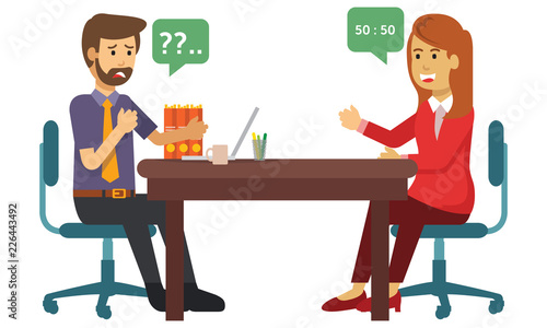Сцена в кофейне. Счастливые мужчина и женщина пьют кофе, разговаривают друг с другом, сидя за столом, плоская векторная иллюстрация. Романтическая влюбленная пара на свидании. Кофейня, интерьер кафе.