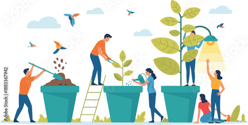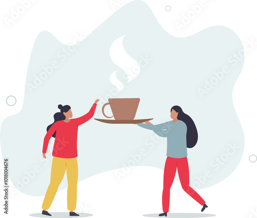 Векторная иллюстрация большой одноразовой кофейной чашки и измученных персонажей, думающих о кофе и активных полетах, как супермен после кофейного напитка. Концепция преимуществ кофе для веб-баннера, страницы веб-сайта