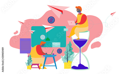 Крошечные персонажи команды бариста готовят кофе, используя большую кофеварку, чайник, ложку, векторную иллюстрацию. Композиция для кофейни, кафе, бара или кофейни для веб-баннера, страницы веб-сайта и т.д.