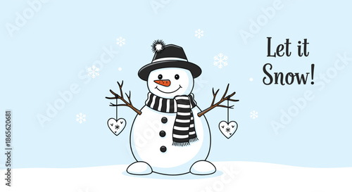 Холодная зимняя векторная иллюстрация дизайна в плоском стиле. Снеговик, коньки, наушники, санки, теплые варежки и шарф, снежинка. Зимняя композиция для веб-баннера, страницы сайта и т.д.