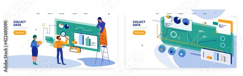 Сбор данных дизайн целевой страницы, шаблон баннера веб-сайта набор плоских векторных иллюстраций. Люди ищут информацию для составления финансового отчета. Бизнес-стратегия, анализ данных, статистика, аудит