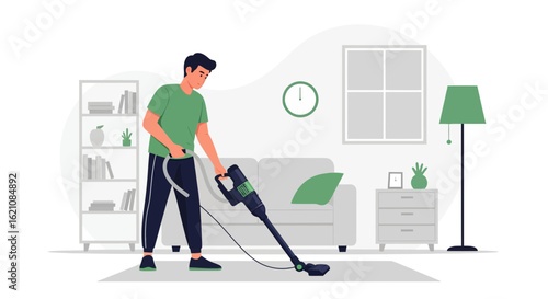 Женщина моет пол с помощью швабры, векторная плоская иллюстрация, изолированная на белом фоне. Профессиональные коммерческие услуги по уборке, мытью полов.