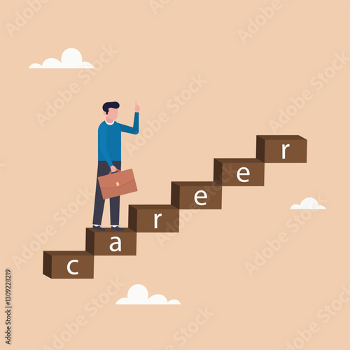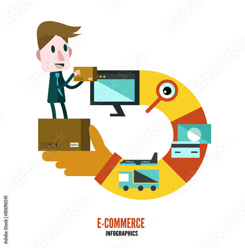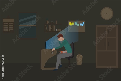 Администратор компании работает с компьютером в офисе. Бизнес-план и круговая диаграмма доли рынка. Векторный плакат в плоском стиле.