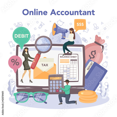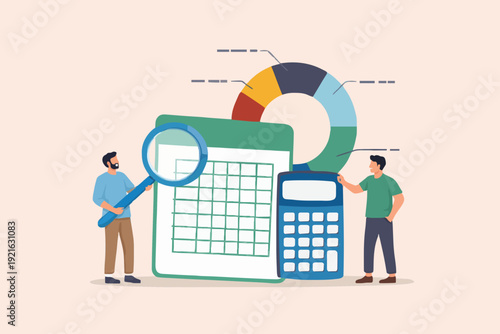 Планирование бюджета компании, финансовый учет, концепция аудита векторная плоская иллюстрация. Буфер обмена с финансовым бюджетным планом, калькулятором, символами, анализирующими диаграмму с лупой, сидящими на монетах.