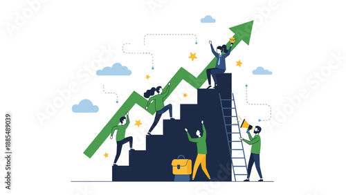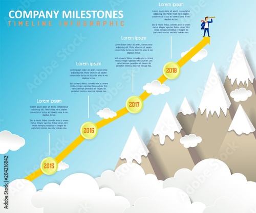 Векторная инфографика временной шкалы вех компании. Шаблон временной шкалы событий компании с вырезанным из бумаги горным камнем и облачным пейзажем.