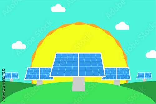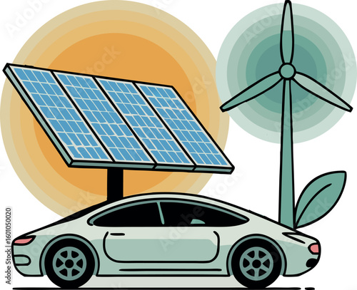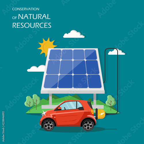 Векторная иллюстрация концепции сохранения природных ресурсов. Эко-мобиль или электромобиль заряжаются энергией, вырабатываемой солнечными батареями. Элемент дизайна в плоском стиле для веб-шаблона, плаката, баннера и т.д.