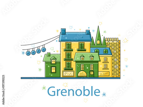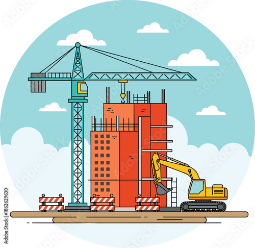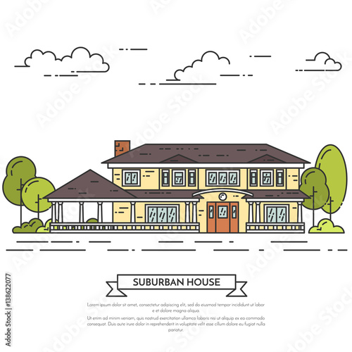 Векторная иллюстрация концепции строительства эко-дома с современным эко-зданием и ветряными турбинами. Экологическая концепция тонкий линейный элемент дизайна в плоском стиле для веб-баннеров и печатных материалов.