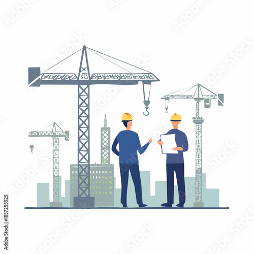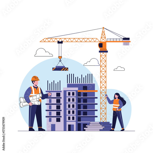 Рабочий-строитель, укладывающий кирпичи, работает на строительной площадке, архитекторы смотрят на архитектурный проект современного городского здания, плоская векторная иллюстрация. Строительная бригада. Строительная промышленность.