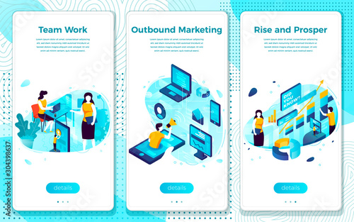 Экраны загрузки веб-сайта контент-маркетинга и мобильных приложений. Векторный шаблон баннера меню для разработки веб-сайтов и приложений с синими плавными формами. SMM, статистика аккаунта, информация, показатели.