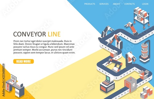 Шаблон веб-сайта целевой страницы конвейерной линии. Векторная изометрическая промышленная автоматизированная производственная линия с роботизированными манипуляторами. Завод автоматической сборки.