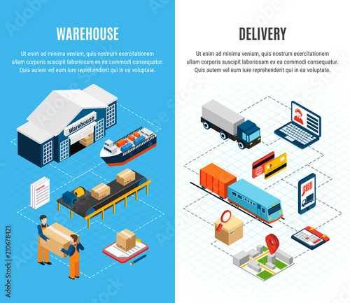 Набор плоских изометрических плакатов с конвейерным вектором. Конвейерная система, Производственные и упаковочные линии, Элементы концепции управления производством для веб-баннеров, печати, инфографики.