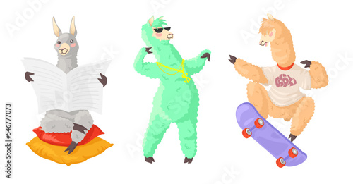 Классный плоский вектор персонажа лам альпак. Забавный хипстерский животный талисман, выделенный на белом фоне. Веселое пушистое существо катается на скейтборде, читает газету, читает рэп-мультфильм