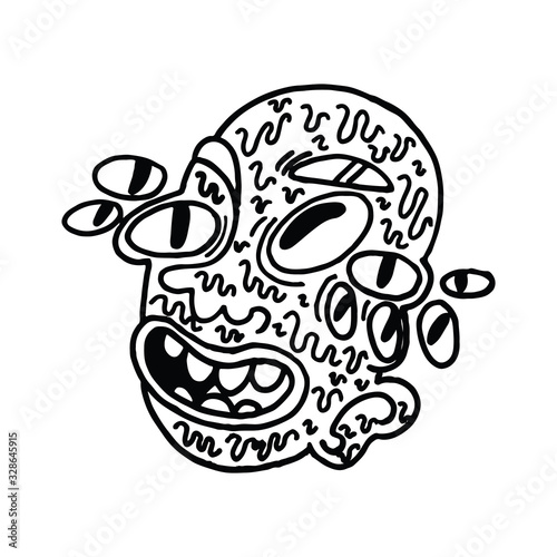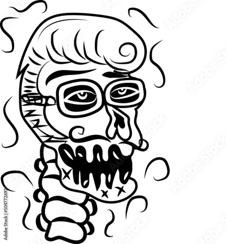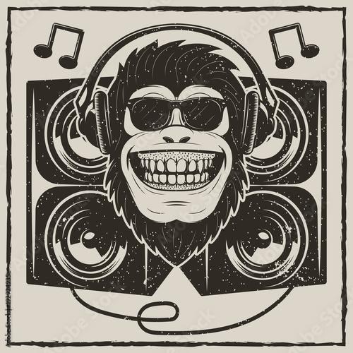 Забавная обезьяна в солнцезащитных очках слушает музыку векторный эскиз гранж иллюстрации. Крутая музыкальная обезьяна в наушниках с винтажным модным дизайном печати на футболке.