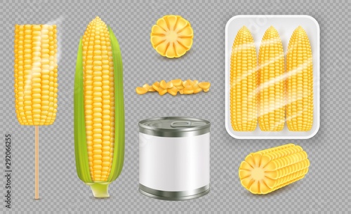 Белый пустой лоток для упаковки кукурузных кормов с набором макетов, обернутых полиэтиленовой пленкой. Векторная реалистичная иллюстрация, изолированная на белом фоне.