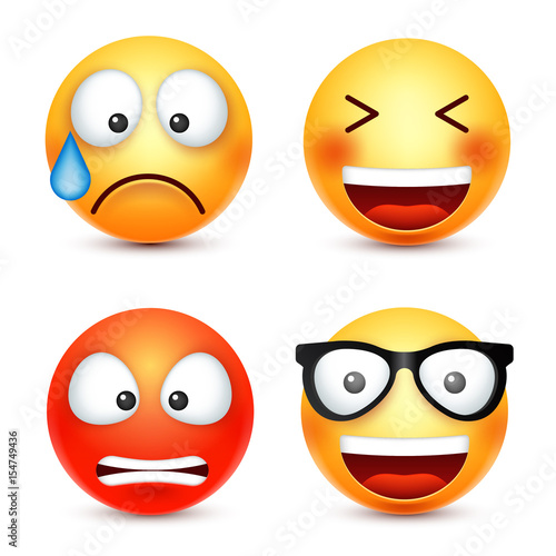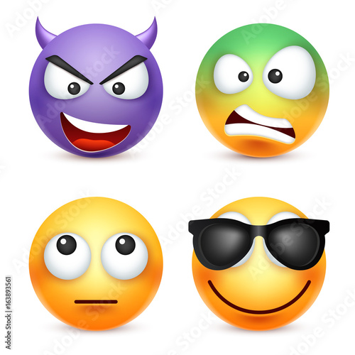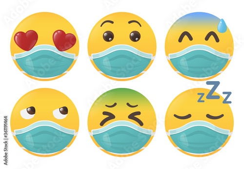 Набор смайликов с маской для лица, векторная изолированная иллюстрация. Желтая улыбка в медицинской маске для общения в социальных сетях. Симпатичные символы-смайлики для электронного общения. Концепция коронавирусной болезни COVID-19