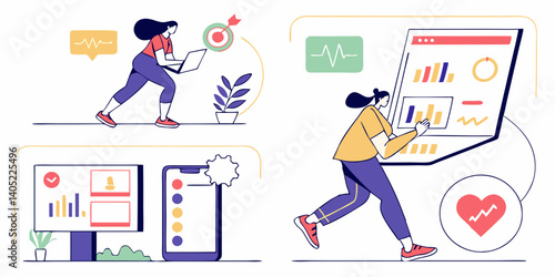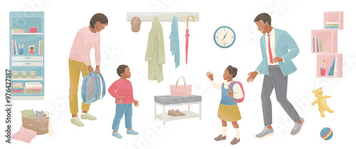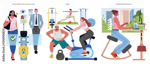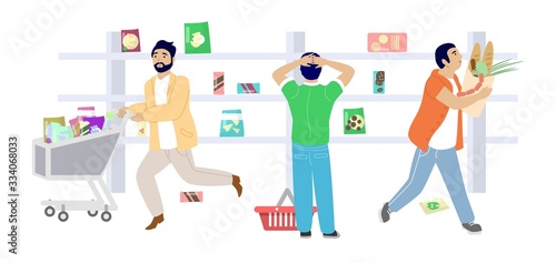 Паническая покупка из-за коронавируса, векторная плоская иллюстрация. Озабоченные персонажи мужского пола в медицинских масках опустошают полки в супермаркете или продуктовом магазине. Страх нехватки продовольствия, концепция покупки "остановите панику".